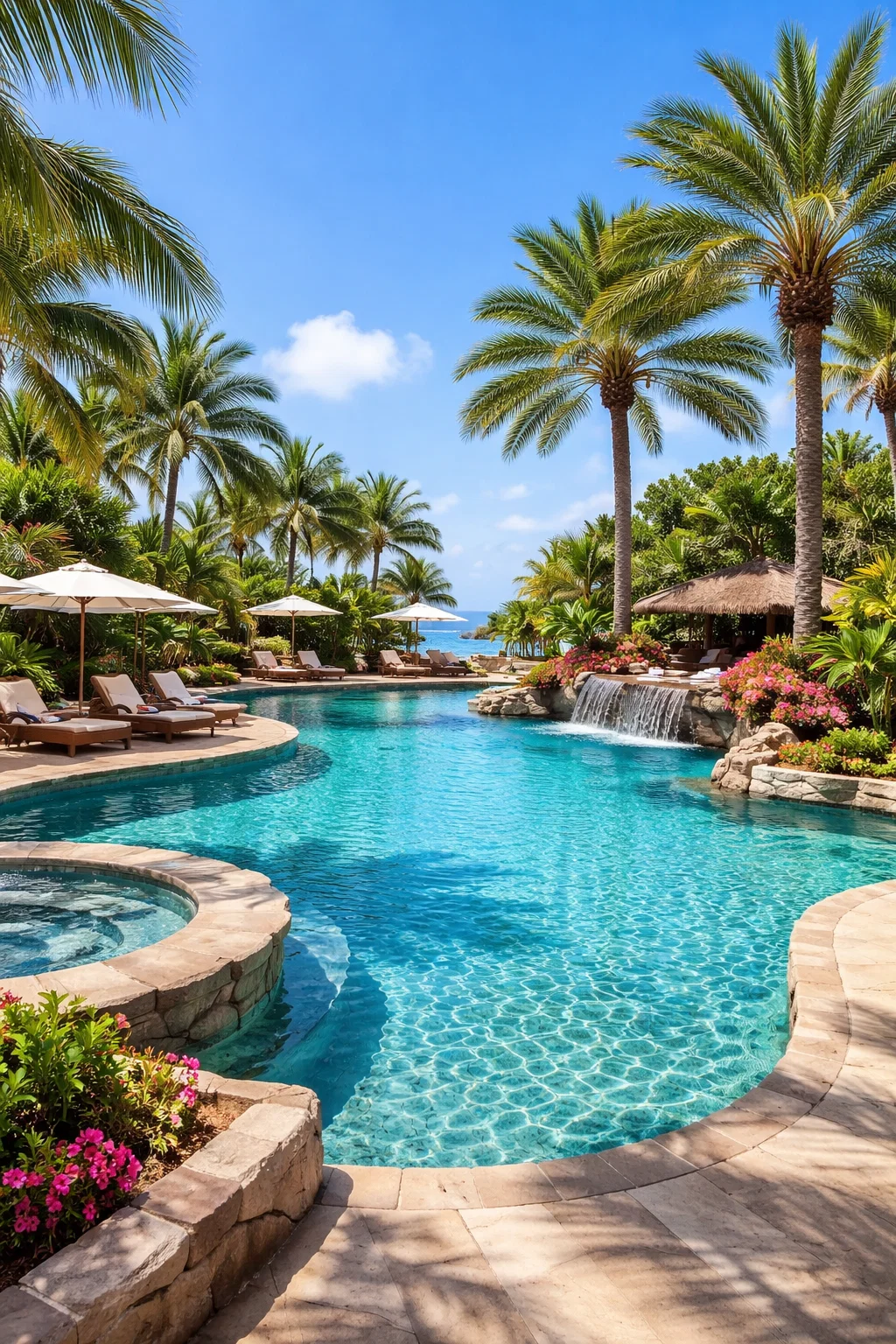 - حمامات الخرسانة المسلحة: الاكثر فخامة ومرونة في التصميم وتقدر تعمل اي شكل مثل مستطيل او دائري او حر مع شلال جاكوزي مدكج لكن تحتاج عزل مائي احترافي.